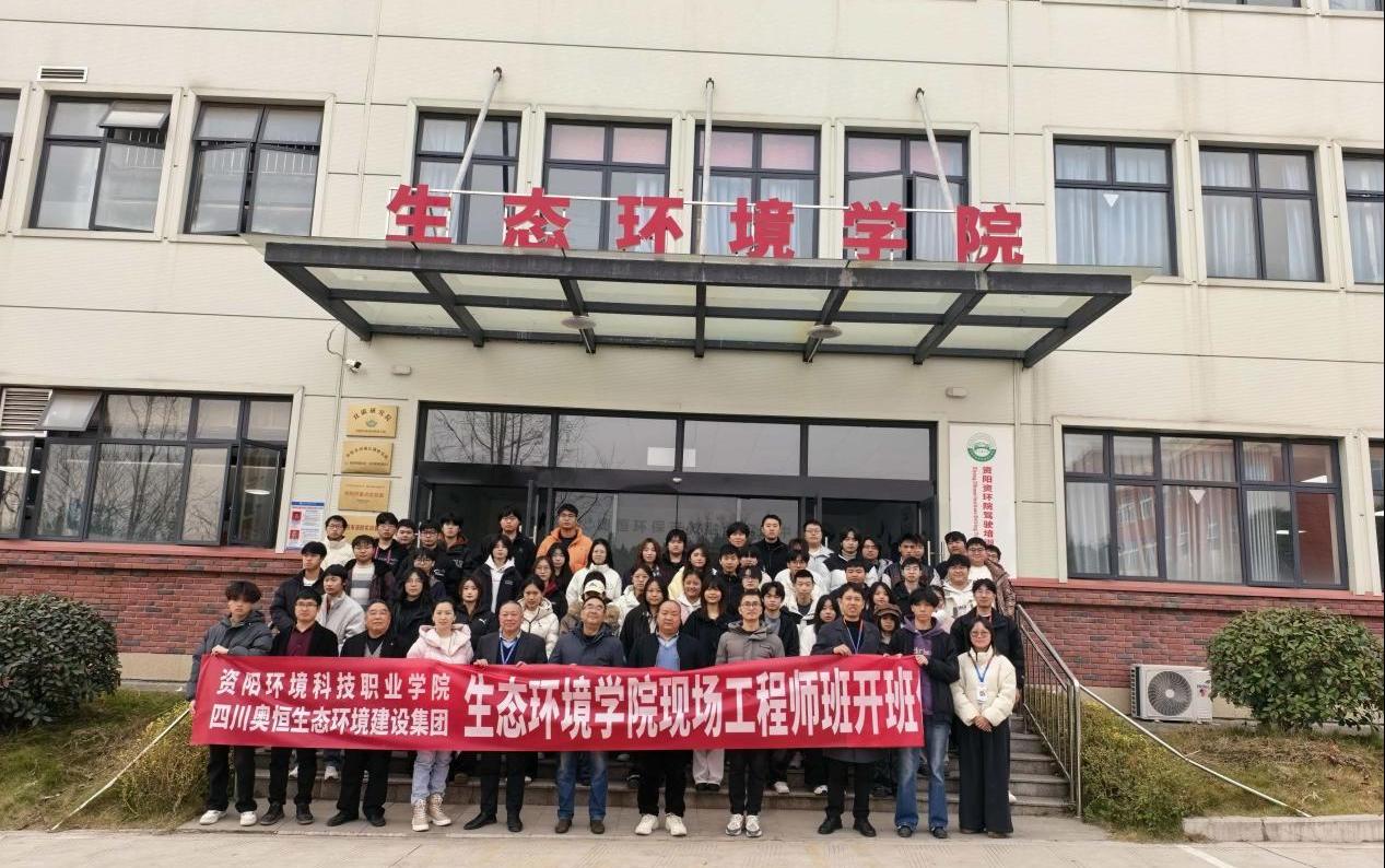 2025年12月17日下午,资阳环境科技职业学院生态环境学院第二届现场工程师班开班仪式在奥恒一楼干部培训室隆重举行。学校校长助理兼教务处处长季辉、四川奥恒生态环境建设集团董事长刘耀中、生态环境学院党总支书记孙传胜、副院长黄相玲等校企双方领导嘉宾、以及环境工程技术教研室教师代表与2024级现场工程师班全体学生共同见证开班时刻,会议由学院副院长黄晓波主持。