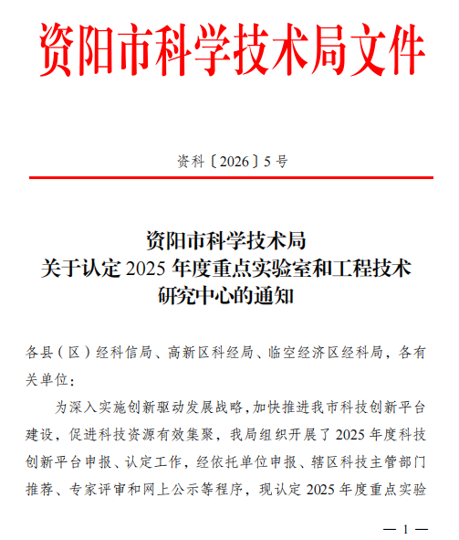 2026 年 1 月 21 日,资阳市科学技术局正式印发《关于认定 2025 年度重点实验室和工程技术研究中心的通知》(资料〔2026〕5 号),由我校生态环境学院牵头、联合四川新环科技有限公司共建的资阳市环境保护工程技术研究中心成功通过市级认定。这是我校继 “资阳市生态环保工程研究中心” 后,在环保科研领域新增的高水平实体化平台,恰逢国家 “十五五” 规划谋划与推进的关键阶段,将为资阳践行绿色发展理念、融入国家中长期生态保护战略注入强劲科研动能!