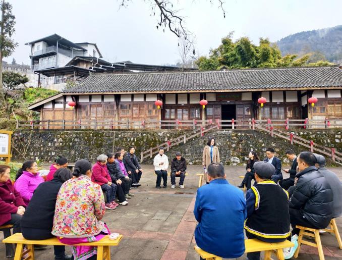 调研团一行系统了解石椅村从灾后重建到脱贫攻坚、再到乡村振兴的奋斗历程,全面掌握村域区位条件、羌族文化传承、特色产业培育、基层治理实践等情况,深入学习石椅村推动民族文化与乡村旅游深度融合、实现共同富裕的生动实践。