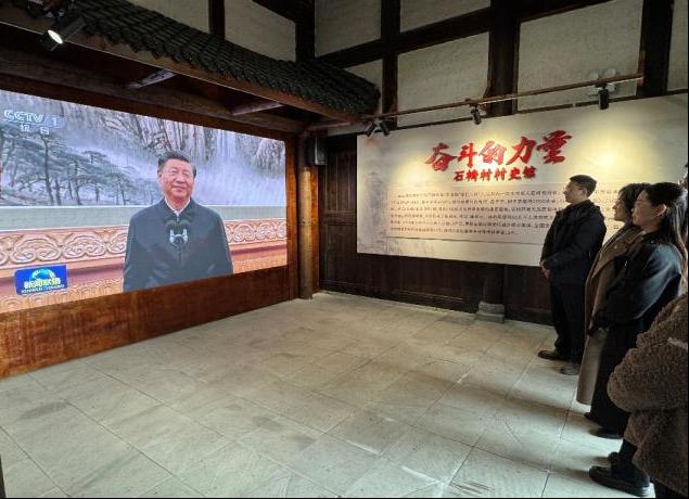 在李邦裕副镇长陪同下,宣讲调研团一行实地参观石椅村村史馆,重温习近平总书记殷殷嘱托,集中学习观看 2023 年春节前夕习近平总书记在北京通过视频连线看望慰问石椅村干部群众的珍贵影像资料,深刻感悟总书记对民族地区基层干部群众的亲切关怀与对乡村全面振兴的殷切期望。