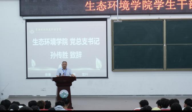为提升学生干部的综合素质与工作能力,明确学生干部的职责与使命,2025年9月23日18:30,生态环境学院在C103教室举办了学生干部培训大会。此次参会的主要是班长、团支书、学习委员、安全员、寝室长、信息员等学生干部,共计200余人参加。生态环境学院党总支书记孙传胜、学生科长张明亮、团总支书记钟骏倚出席会议并发表讲话。